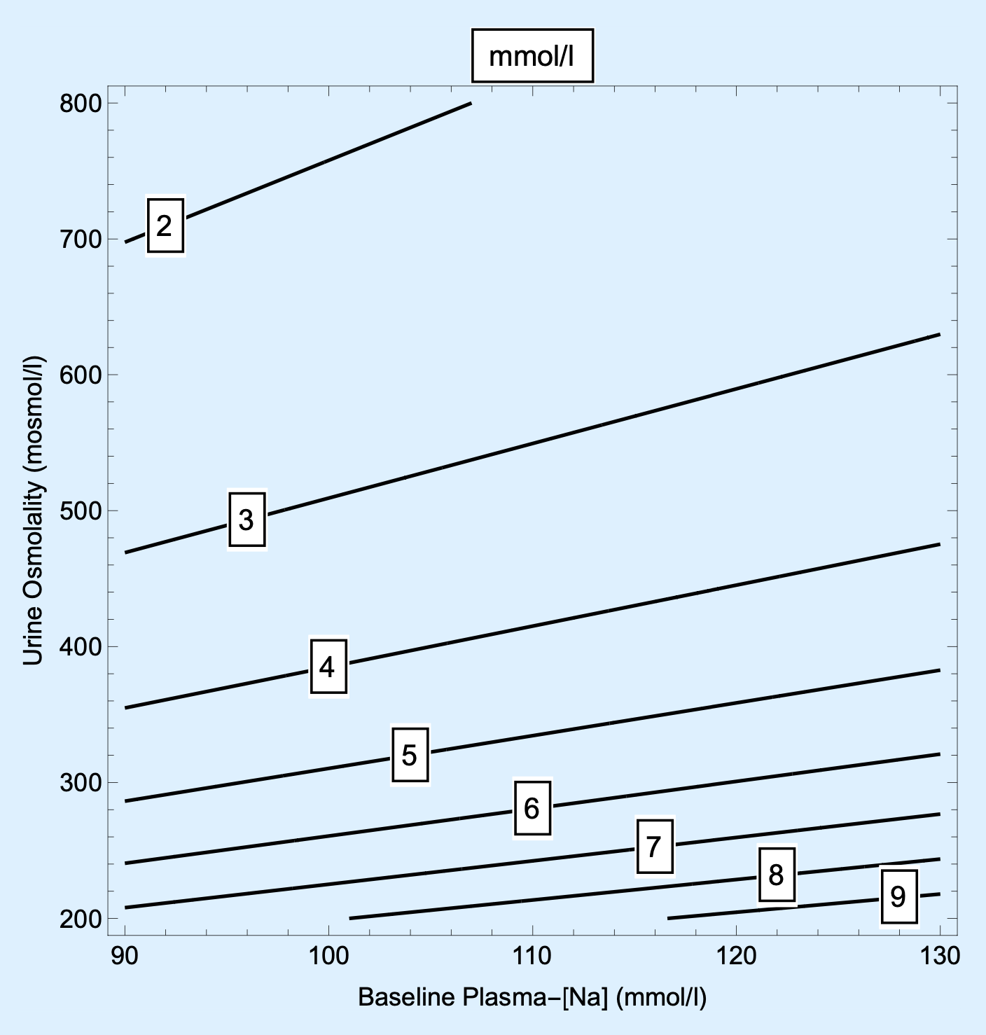 Figure 1. Contour plot demonstrating the expected increase in plasma-[Na] due to a 30g urea dose as a function of baseline plasma-[Na] (x-axis) and urine osmolality (y-axis). Total body water set at 41.5 liters.